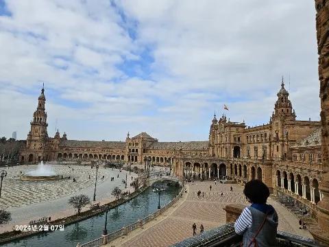 - 스페인 각 도시의 문장과 역사적 사건이 그려진 컬러풀한 타일 벤치 * 광장을 감싸 안은 수로와 분수가 만드는 평화로운 풍경